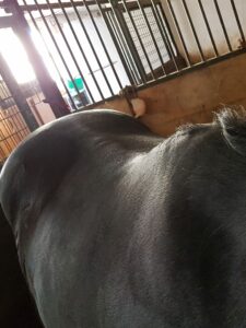 Kurz gesagt, eine unharmonischen Oberlinie, bei der der Brustkorb zwischen den Schulterblättern deutlich abgesunken ist. Ein Senkrücken ist oft sichtbar.