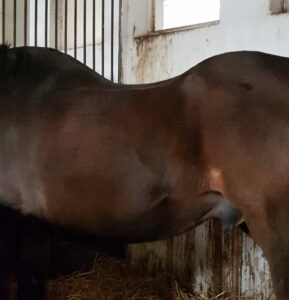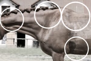 Leider wird es oft übersehen, obwohl die Anzeichen so deutlich sind. Man erkennt es an einer falsch ausgeprägten oder nicht vorhandenen Muskulatur. Löcher hinter dem Schulterblatt, eine herrausstehende Wirbelsäule, ein abgesacktes Brustbein, fehlende Muskeln am Halsansatz – oft mit einem ausgeprägten Unterhals begleitet, ein nach unten gedrückter Rücken, fehlende Brust- und Rumpfmuskeln usw…